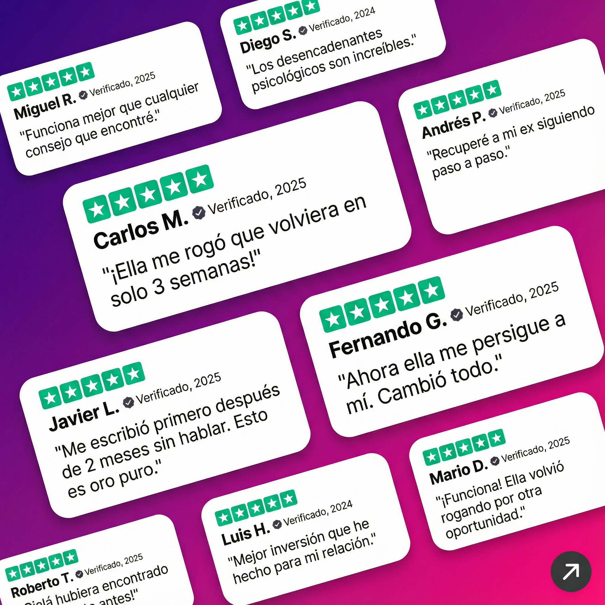 Cuando me dejó por otro chico, pensé que mi mundo se había acabado. No podía comer ni dormir. Vi la guía en Instagram y tuve que comprarla. Esas técnicas de competencia funcionaron de maravilla 😂. Básicamente, ella empezó a compararme con su nuevo novio (en el buen sentido). El mes pasado, rompió con él y me pidió otra oportunidad. Lo estamos tomando con calma, pero las cosas están mejor que nunca 🙏.